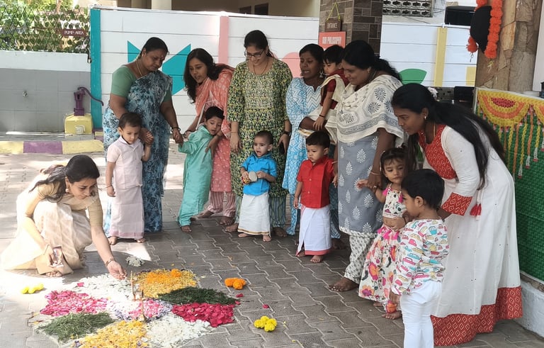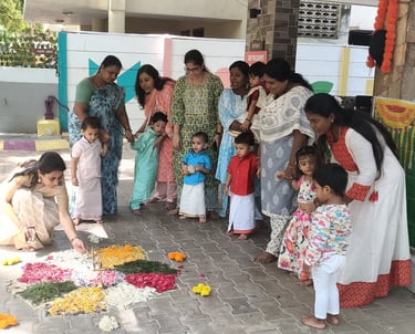The children crafted Ashoka leaf thorans and enjoyed dance sessions with teachers. Sundal sharing and exposure to classical instruments completed the enriching celebration.